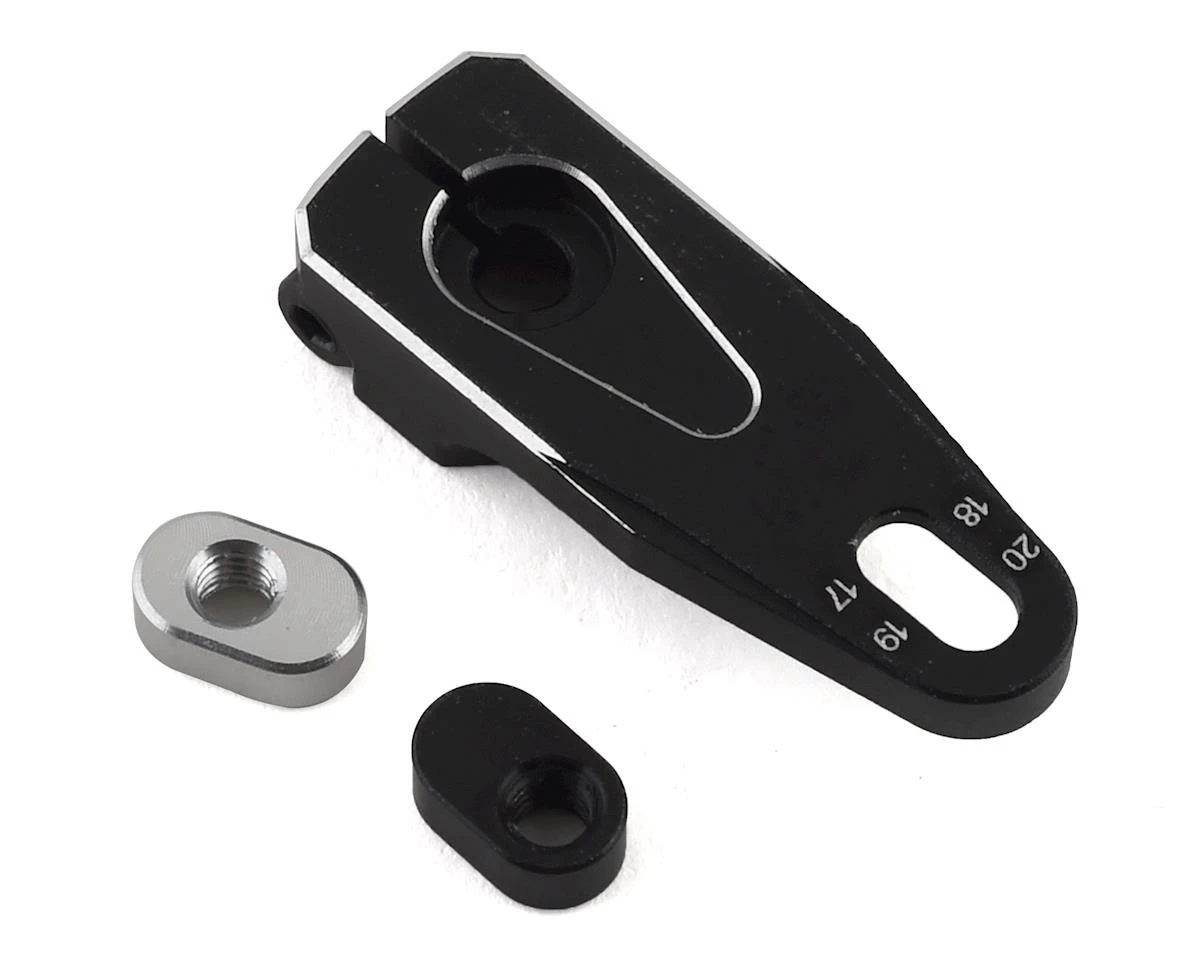The design uses different inserts to adjust the mounting point on the horn by simply flipping the insert to alter the position of the hole. The black insert allows 17 and 20mm positions, while the silver insert allows 18 and 19mm positions. The inserts are threaded, and are secured to the horn by the ball stud. Package includes one servo horn, one black insert, and one silver insert.