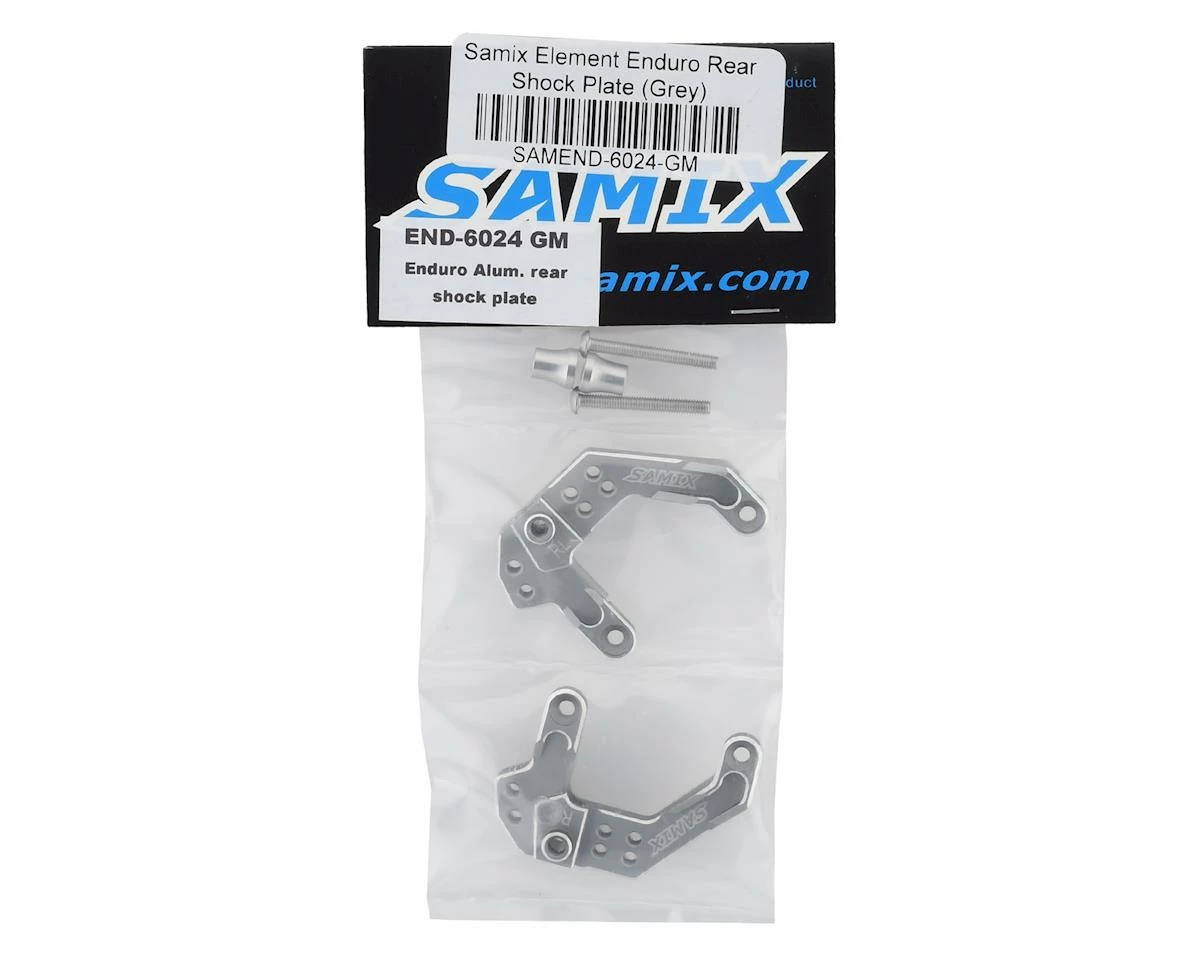 The Samix Element Enduro Rear Shock Plate is a precision machined rear shock tower option for your Enduro build. Available with a black, or grey finish, these towers feature chamfered edges, an etched logo and a smooth surface finish that will increase strength and give your truck a custom look that cannot be matched by the stock parts. Plus, these towers also provide six additional shock mounting options that allow increased shock angle tuning. Package includes two shock towers, shock mounts and hardware.
