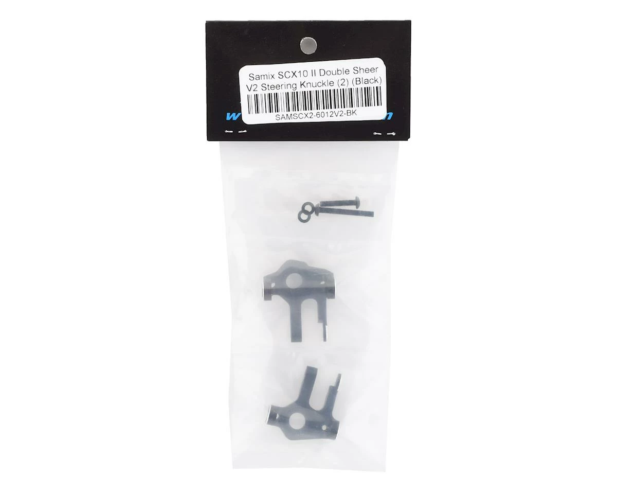 The Samix SCX10 II Double Sheer V2 Steering Knuckle is a precision machined steering knuckle option for your SCX10 II build. Available with a black, grey or green finish, these knuckles feature chamfered edges, an etched logo and a smooth surface finish that will increase strength and give your truck a custom look. The knuckles feature a bearing adapter for the outside bearing to help make installation and removal easy. Package includes two knuckles, two bearing adapters and hardware.