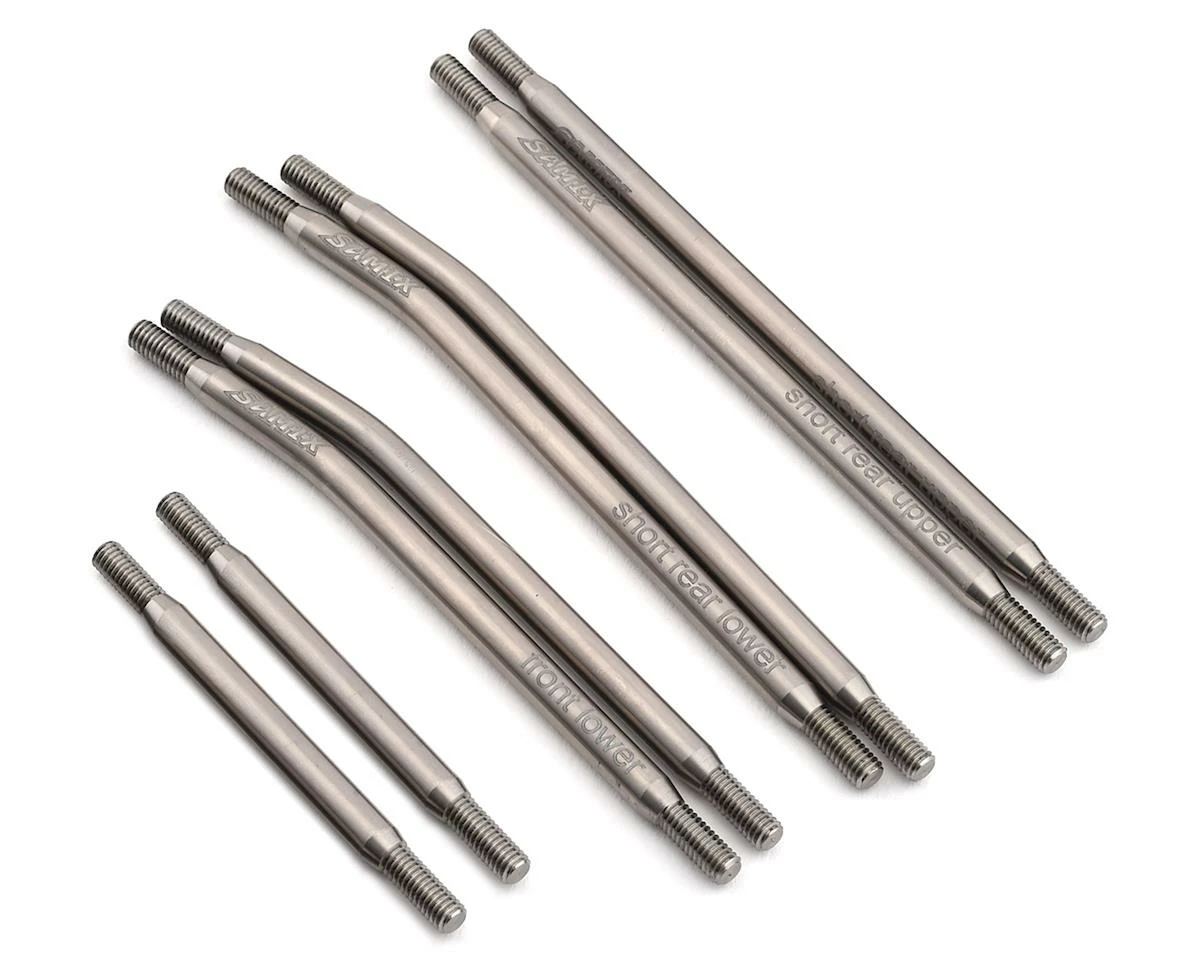 The Samix Traxxas TRX-4 312mm Titanium Links are a great suspension upgrade kit that will retain the stock TRX-4 Bronco and Sport model wheelbase specs. More importantly, these links feature a high clearance bend that helps to increase ground clearance. The link position is marked on each rod to make installation easy. Plus, when compared to aluminum links the titanium material is more durable and slides better over rocks. Package includes all the links needed to upgrade the upper, lower and panhard links on one truck.