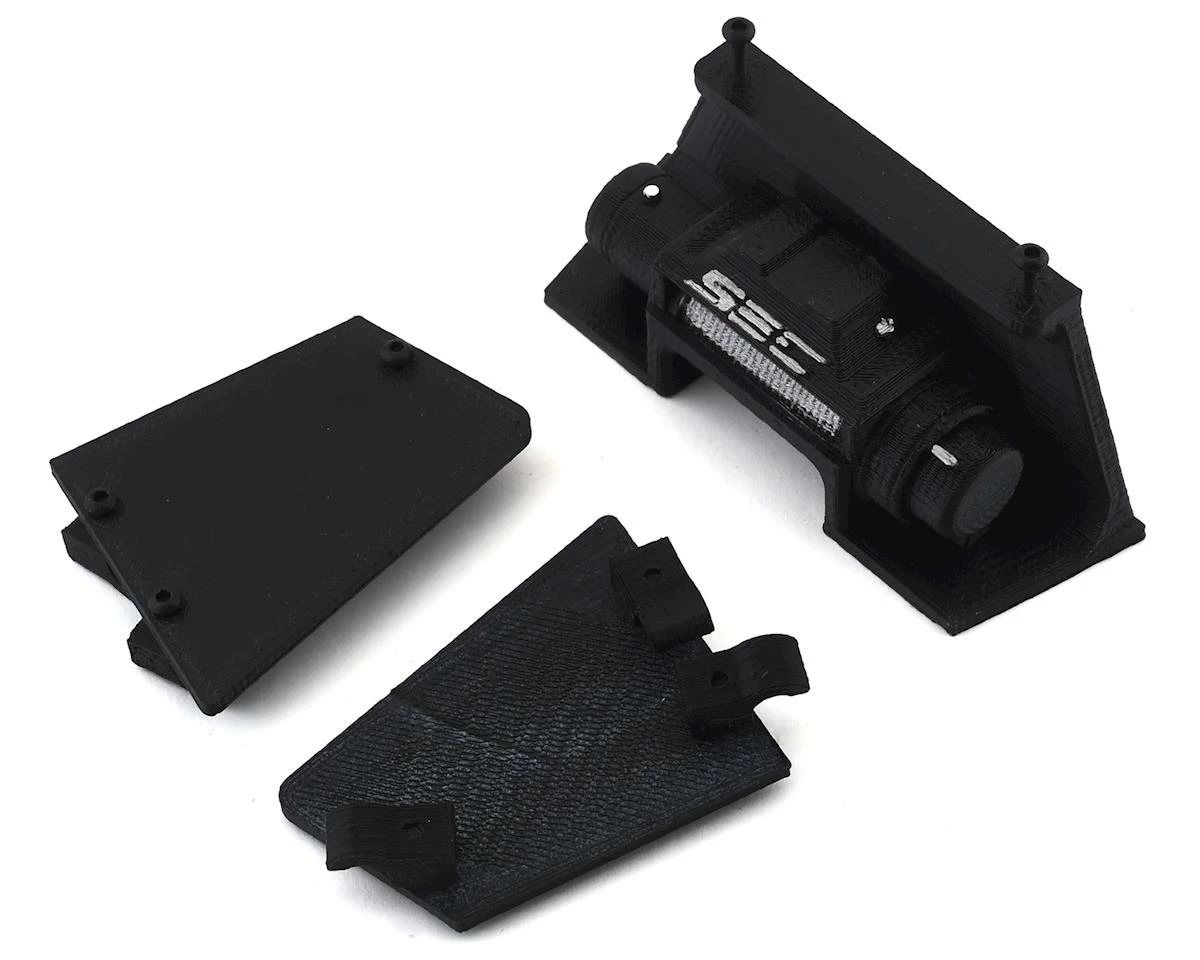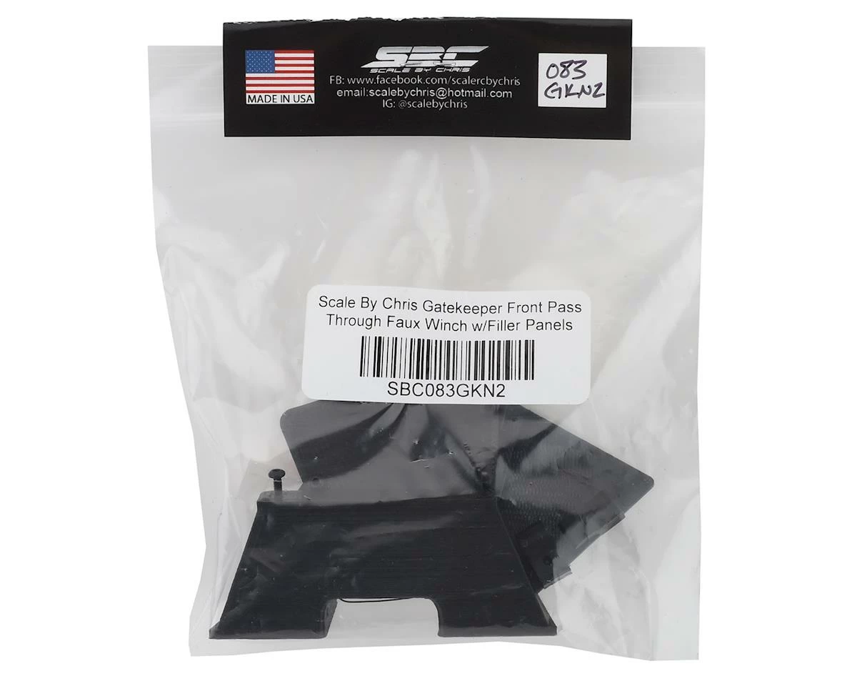 The Scale by Chris Gatekeeper Front Pass Through Faux Winch with Front Filler Panels (SBC083GK) is a great way to add a realistic look to your build. The pass through winch fills in the area behind the front bumper and still allows the use of an internal servo winch. The filler panels are an easy way to fill the void in the front of the cage at the front bumper. This helps to hide the servo and give the Gatekeeper an improved scale look. The panel features pivoting cage clamps on the back side, holding the panel to the cage securely and making them easy to install. If desired, these can be further detailed using Tamiya TS primer and paint.
