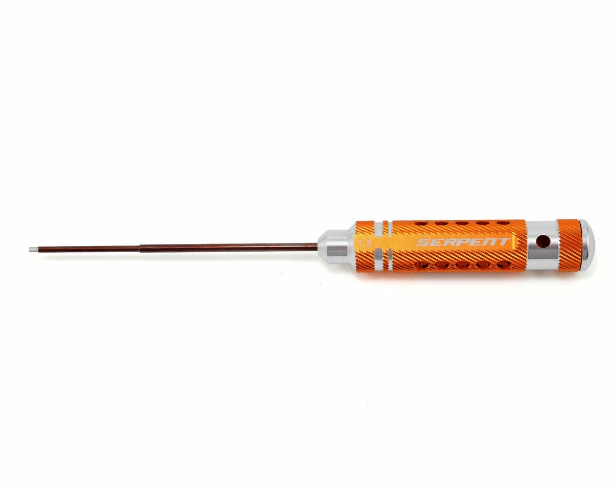 This is a Serpent 1.5x120mm Hex Wrench. Serpent tools feature a lightweight machined aluminum handle and an engraved Serpent logo, combined with precision machined 120mm long hardened spring steel tips. The shape of the handle prevents the tool from rolling off the work bench and the size of the tip is engraved in the handle for easy identification.