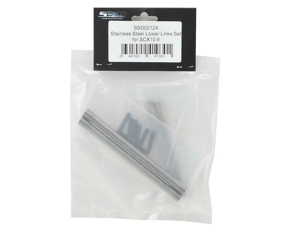 The SSD SCX10 II HD Stainless Steel Lower Link Set improves strength compared to the stock links, and helps to add weight down low. They are compatible with the stock Axial SCX10 II M4 rod ends, and can also be used with SSD M4 rod ends (SSD00116) when combined with SSD Spacers (SSD00151).
