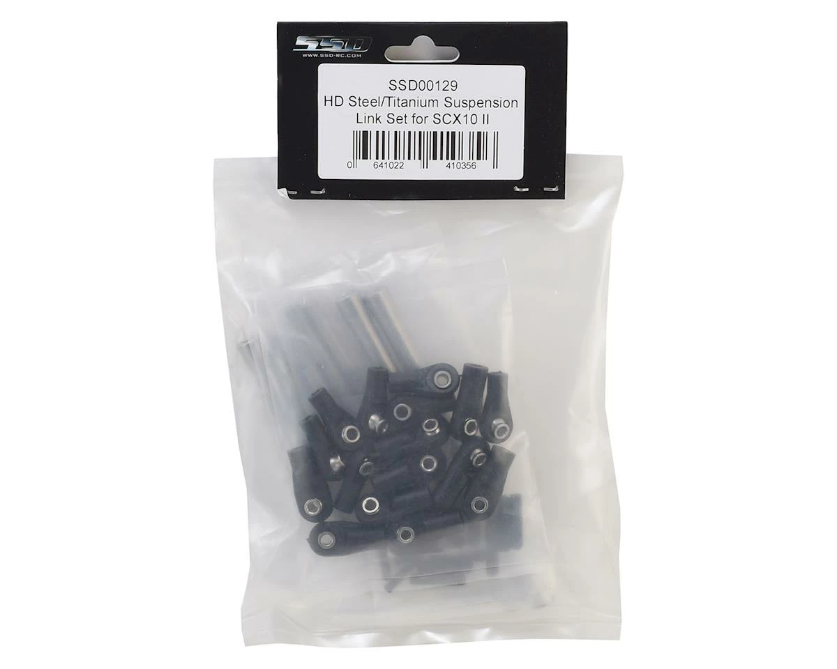 This is an optional SSD HD Steel and Titanium Suspension Link Set for any 313mm wheelbase Axial SCX10 II. This kit cleverly includes heavy duty steel links for all lower positions and provides heavy duty lightweight titanium links in the upper positions. This setup provides an optimal CG setup with weight down low, but no where else.