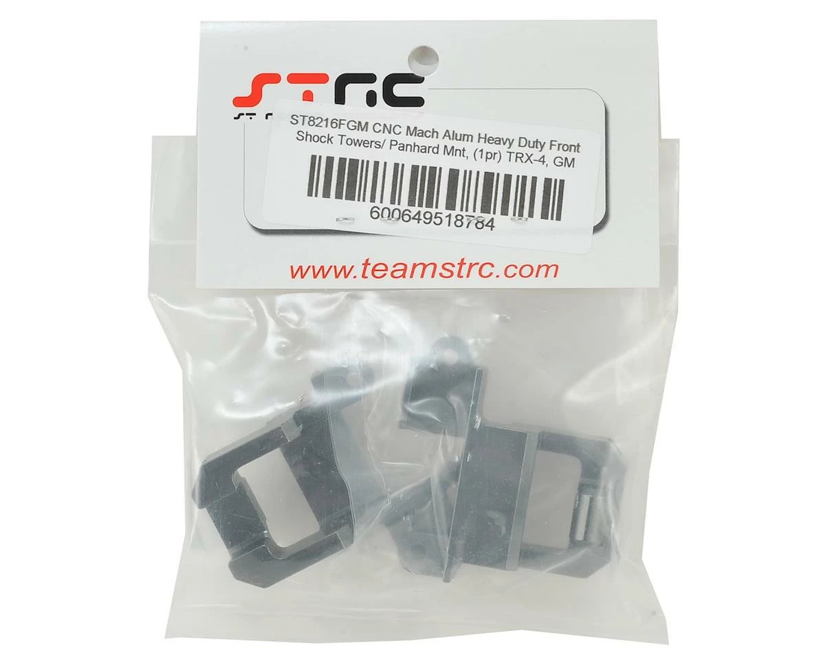 The STRC Traxxas TRX-4 HD Front Shock Towers/Panhard Mount reduces flex at the upper shock mounts and body mounts, and increases durability. The panhard mount is machined into the shock tower to help reduce flex in comparison to the stock piece helping to create a precise panhard link movement.
