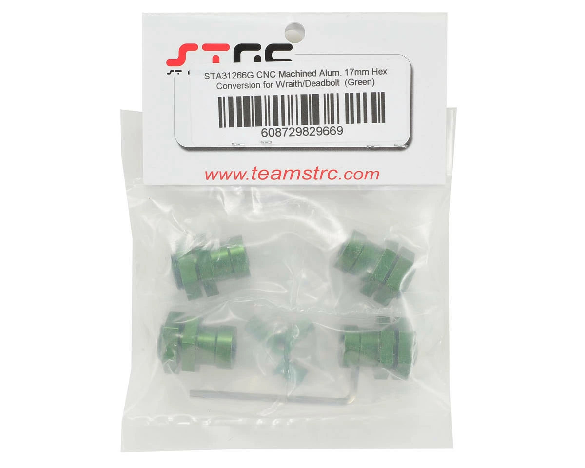 The STRC Wraith Aluminum 17mm Hex Conversion Kit takes your Wraith from puny little crawler, to bone crushing monster! Simply combine this kit with a set of 1/2 offset 17mm Hex wheels and monster truck tires, and give your Wraith or Deadbolt a wider Monster Truck like stance. The system uses an inner lock-nut to hold the 17mm hex adapter to the Wraith axle, and 17mm hex lock-nut to hold down the larger monster truck tires. Open up a whole new range of tire selections and take performance and appearance to another level.