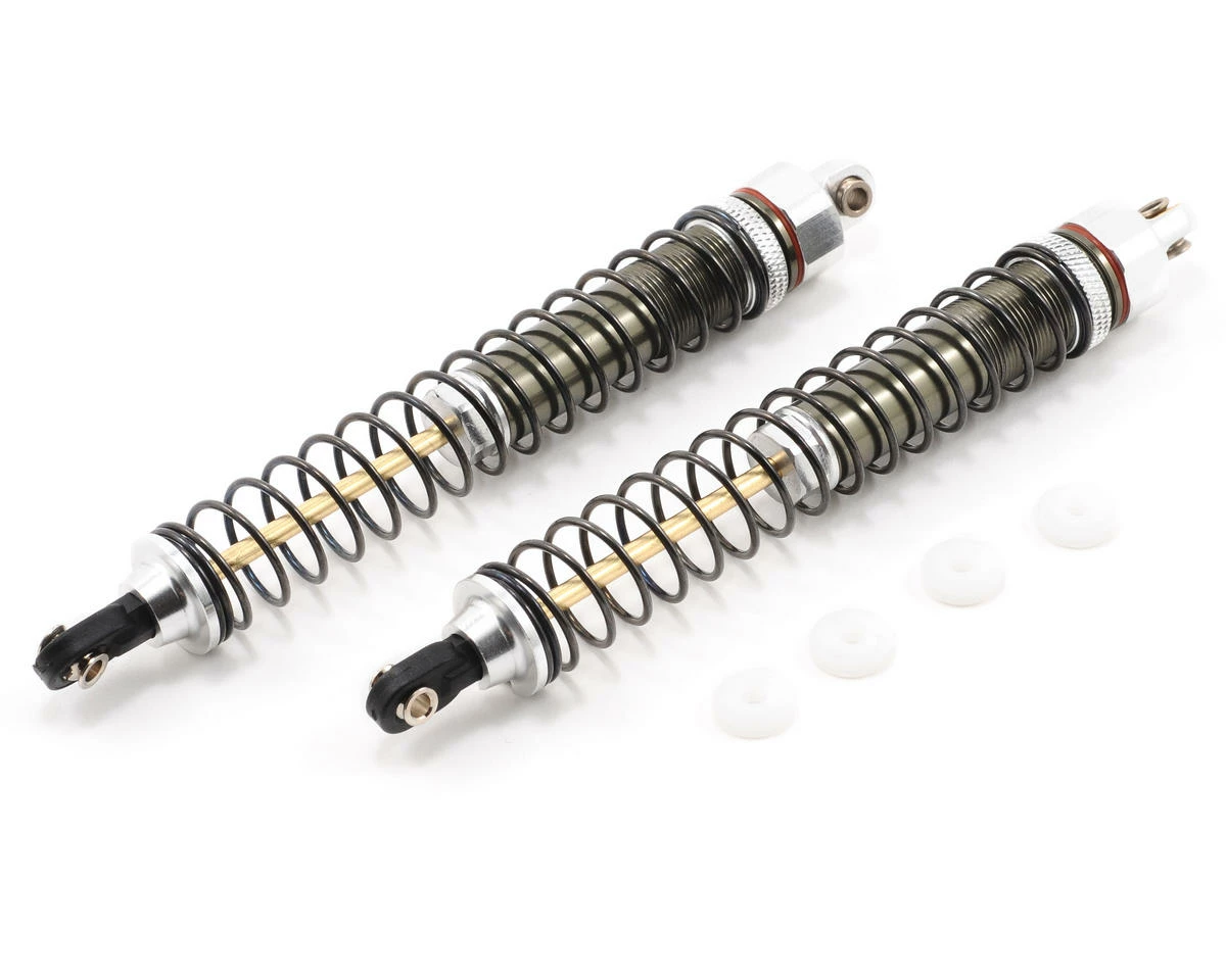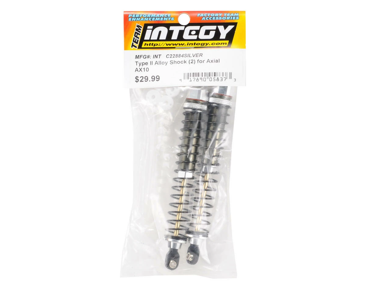 This is an optional Integy Type II Shock Set. Add a custom touch to your AX10 and improve performance with these aluminum threaded body shocks. These shocks are precision machined, and anodized silver for a perfect fit and good looks. Fully extended shock length (mount to mount): 125mm; compressed length: 84mm.