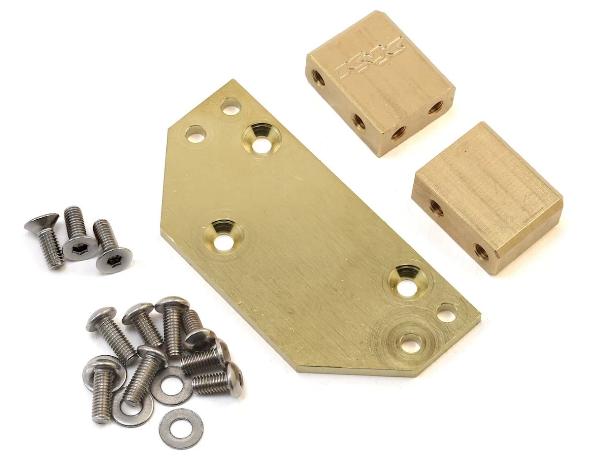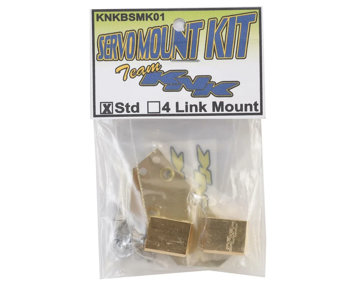 Team KNK Brass Servo Mount Kit gives you another option to add a few grams of unsprung weight to your servo on axle rig. The servo plate and mounts are machined from brass and weigh 65 grams. Package includes all the hardware needed for installation.Â