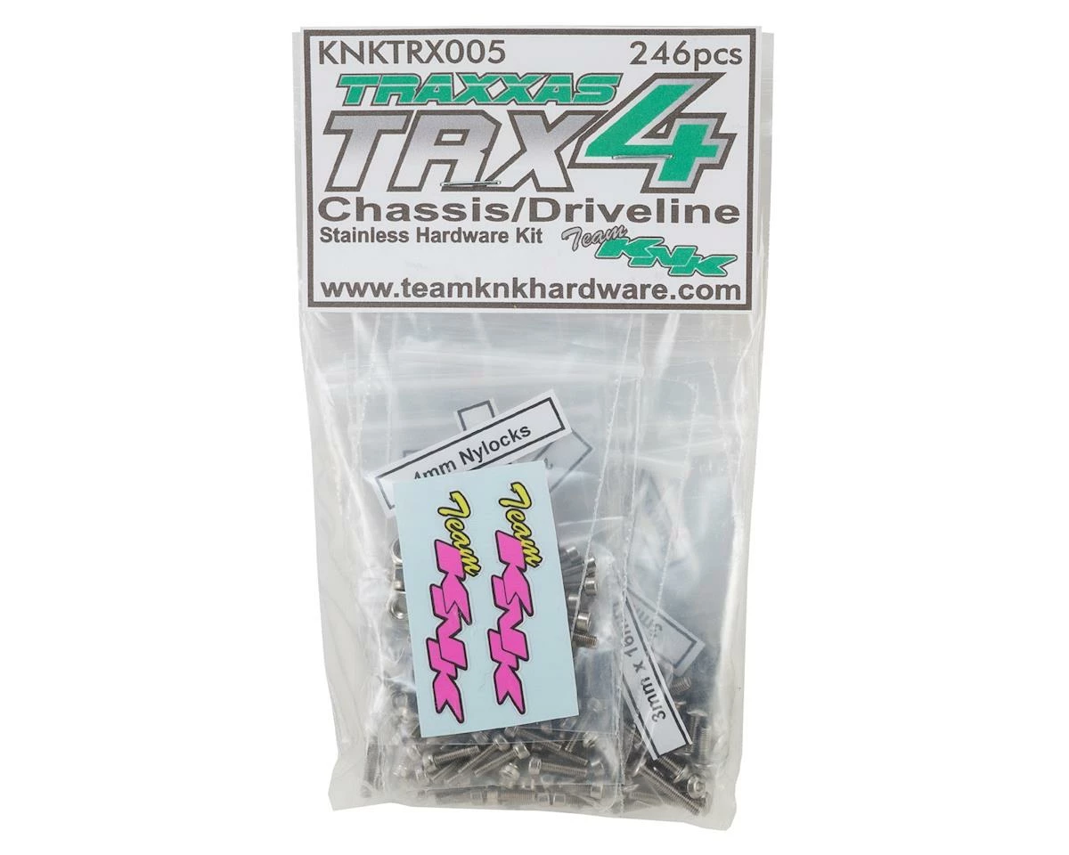 The KNK Traxxas TRX4 Stainless Chassis & Driveline Screw Kit is a must have for any TRX4 owner that refuses to let the elements slow them down. This 246 piece screw kit includes the hardware needed for the chassis and driveline only, packaged by type and length, and labeled to make it easy to identify. This saves you an incredible amount time when searching for the correct size. Plus, unlike other kits on the market, these stainless screws are A2 or 18-8 grade stainless steel, so you are getting the highest quality stainless hardware available.