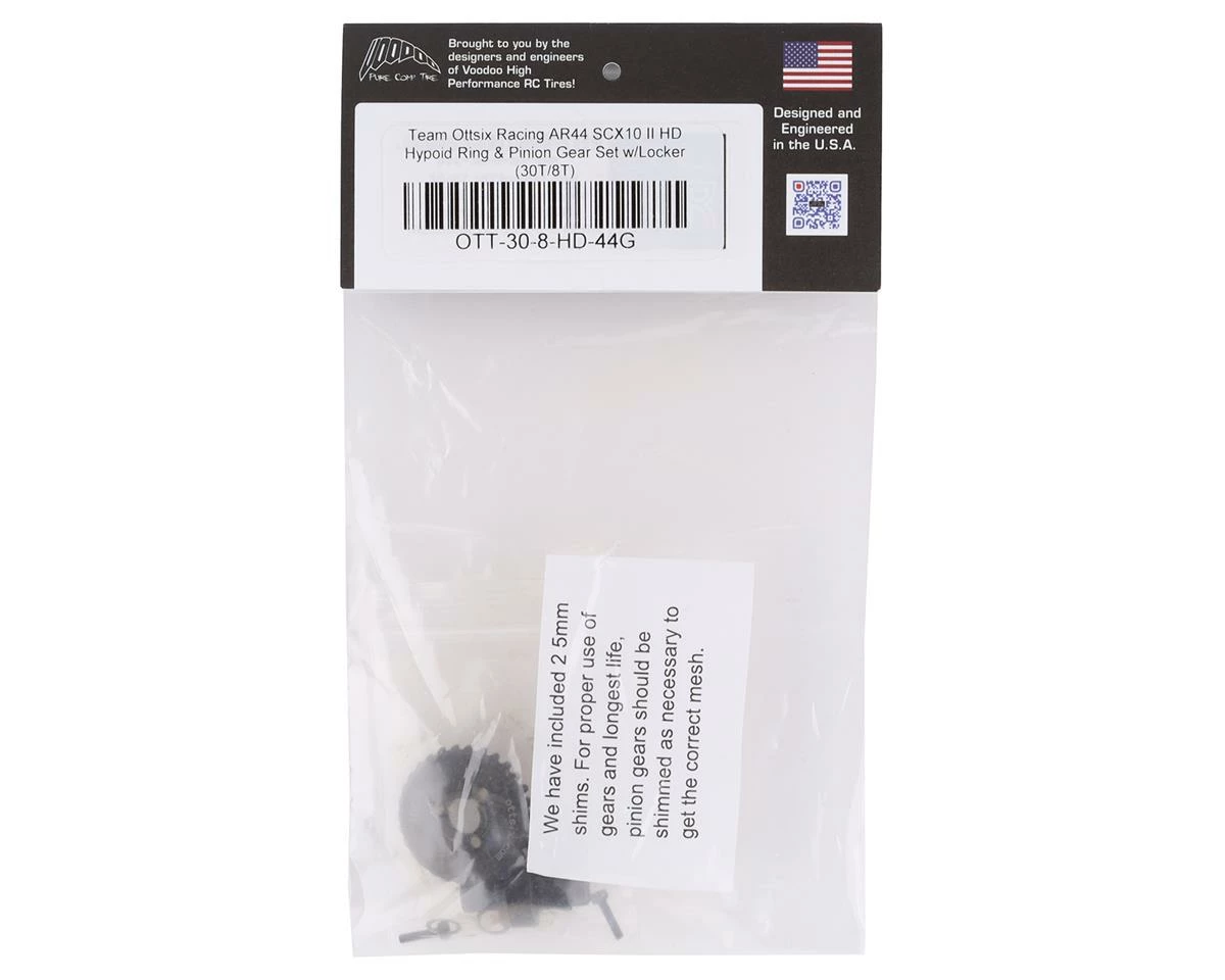 The Ottsix AR44 SCX10 II 30T/8T HD Hypoid Ring, Pinion & Locker Set is a true heavy duty gearing option for the AR44 axle. These gears are available in tooth count options that allow multiple overdrive/underdrive gear ratio options, compared to the stock 30T/8T ratio. The locker features a deep socket design that keys inside the ring gear to take the pressure off the connecting hardware. Combined this with hardened steel ring and pinion material and hypoid cut gears, and you have a gear set that will go the distance. Package includes 30 tooth stock ratio ring gear, 8 tooth pinion gear, locker, and hardware.