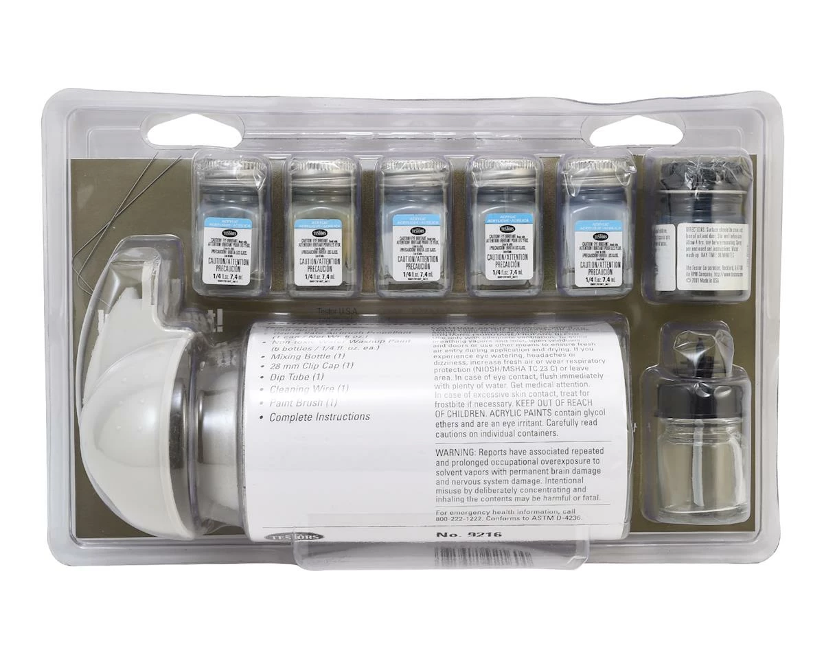 This Acrylic Military Aircraft Spray Paint Set contains gunship gray, dark ghost gray, light ghost gray, neutral gray, olive drab, flat black, primer, glass mixing bottle, clip cap, dip tube, cleaning wire, propellant and cap sprayer.