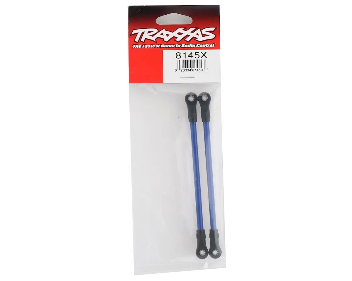 A Traxxas 5x115mm Rear Lower Suspension Link set. This package comes with two blue rear lower suspension links.