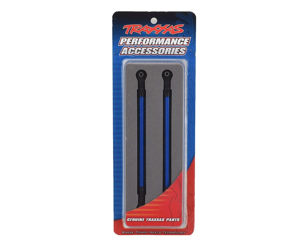 A Traxxas 5x115mm Rear Upper Suspension Link set. This package comes with two blue rear upper suspension links.
