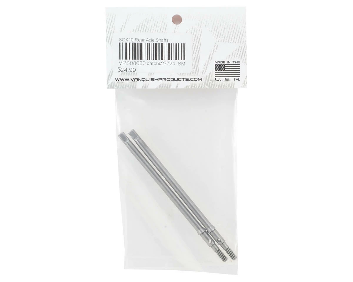This is a pack of two optional Vanquish Chromoly SCX10 Rear Axle Shafts. These axles can be used to replace the stock SCX10 rear shafts and can also be used with the Vanquish Currie SCX10 parts. Package includes two shafts.