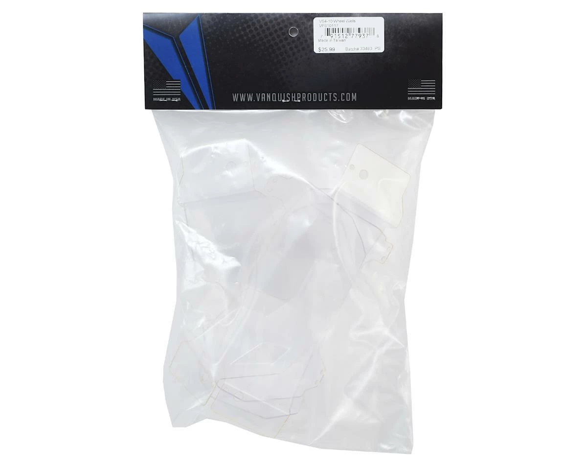 Vanquish VS4-10 Origin Inner Fender Set. These inner fenders are laser cut to fit the VS4-10 chassis. Additional trimming may be required to fit narrow bodies.