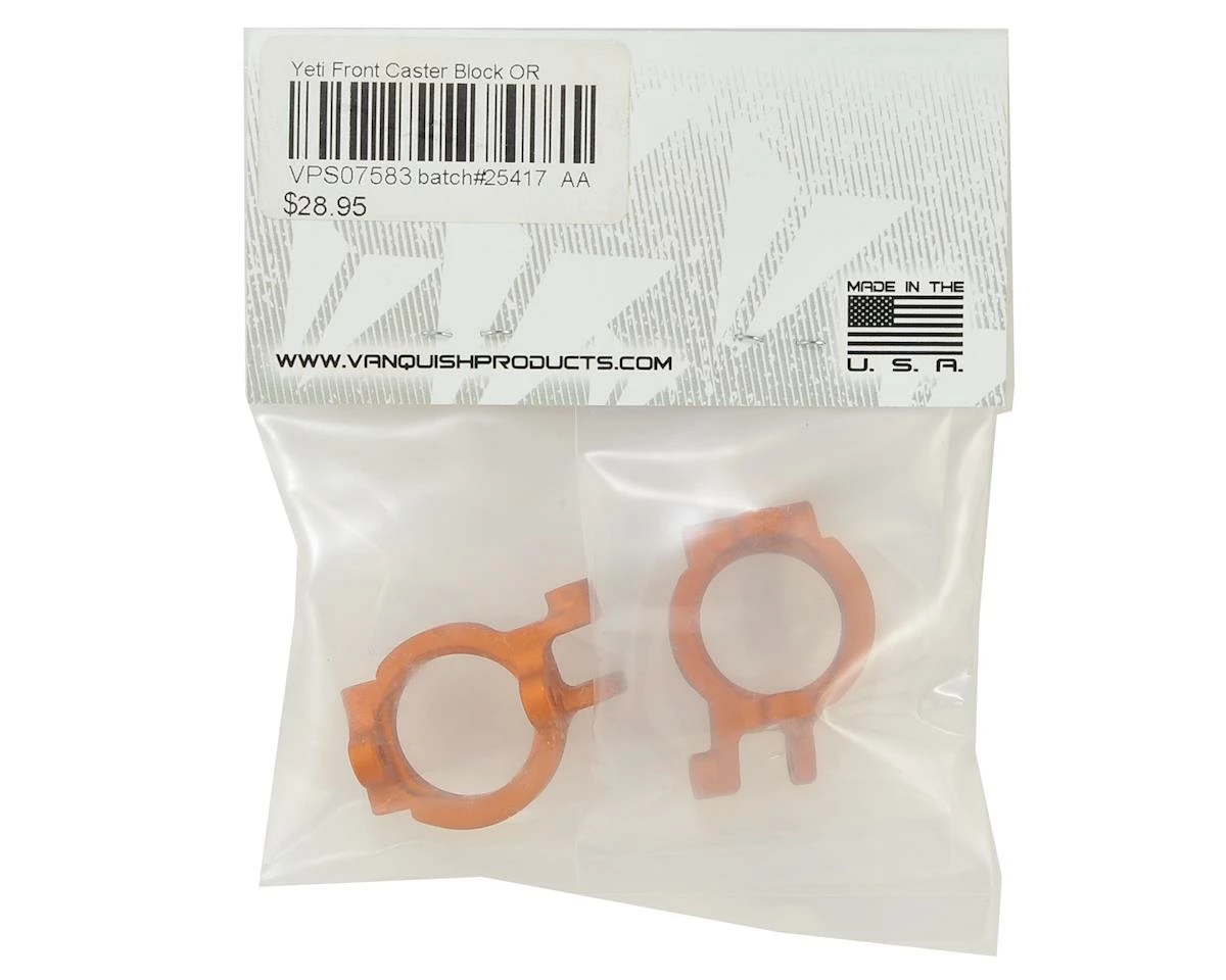 This is an optional Vanquish Yeti Front Castor Block Set. These aluminum front caster blocks are much stronger than the stock parts and are a direct fit upgrade for your Yeti rig.