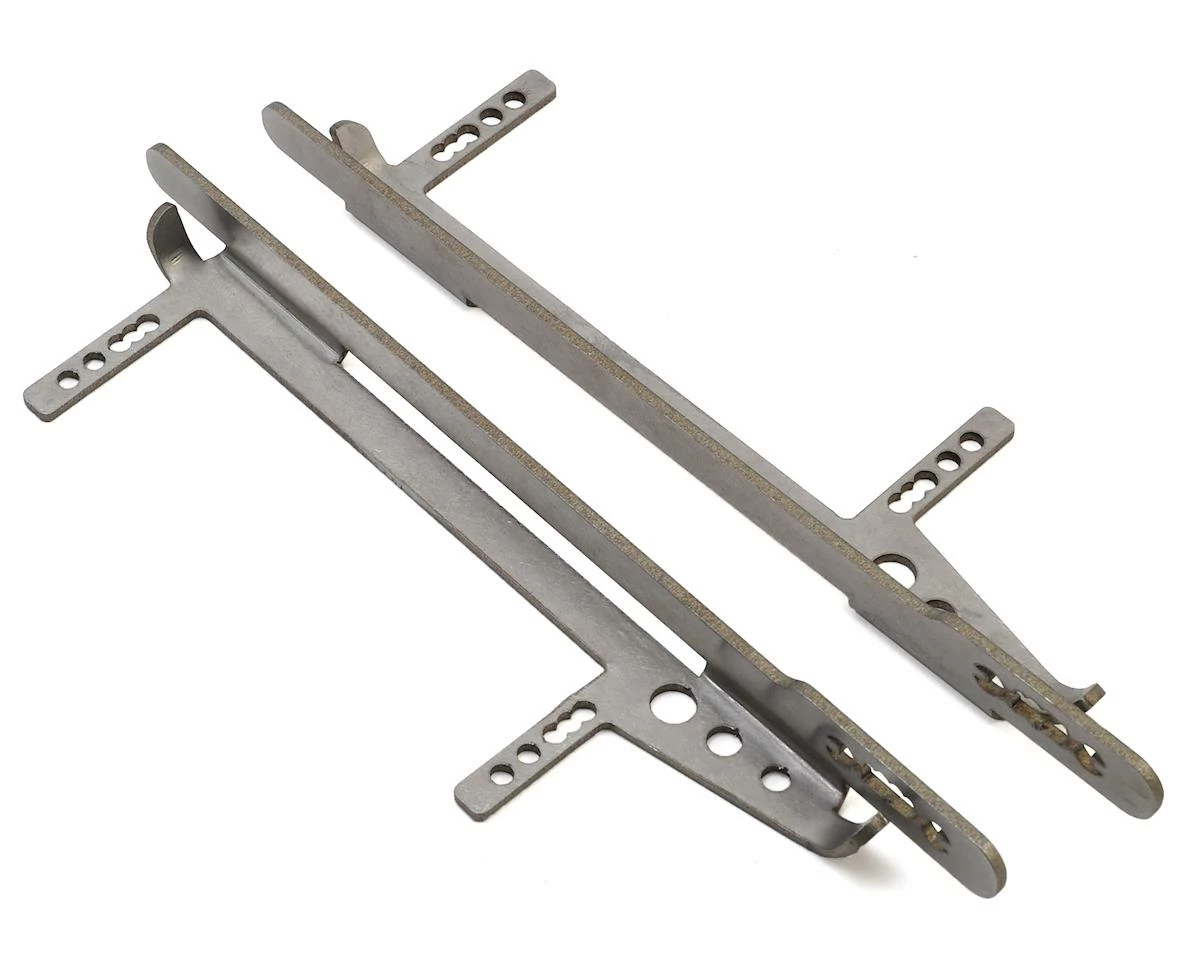 Wertymade SCX10 II Blazer Side Tray Sliders are designed to attach to the side trays of the rig and add protection and scale effect. Designed to provide rock defense and custom styling style to your build, these sliders allow you to keep your stock waterproof radio box and mounting point for your two speed transmission servo. Cut from stainless steel for protection against corrosion and rust, these sliders carry a 3 month warranty against defects. Package includes left and right side sliders.