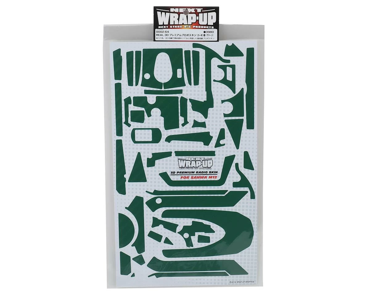 This is a WRAP-UP NEXT REAL 3D Premium M12 Transmitter Green Carbon Skin, a textured set of decals to add depth and style to your boring old radio. This decal sheet has 3D effects for a greater depth of detail, giving the skin a carbon texture.