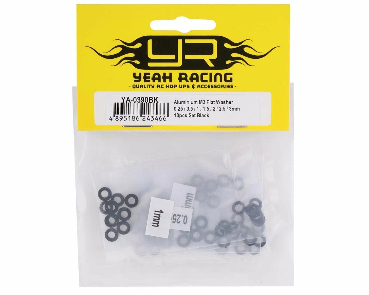 Yeah Racing 3×0.25/0.5/1.5/2/2.5/3mm Flat Washer Set. These optional washers are made from high quality aluminum and anodized black for a clean look.