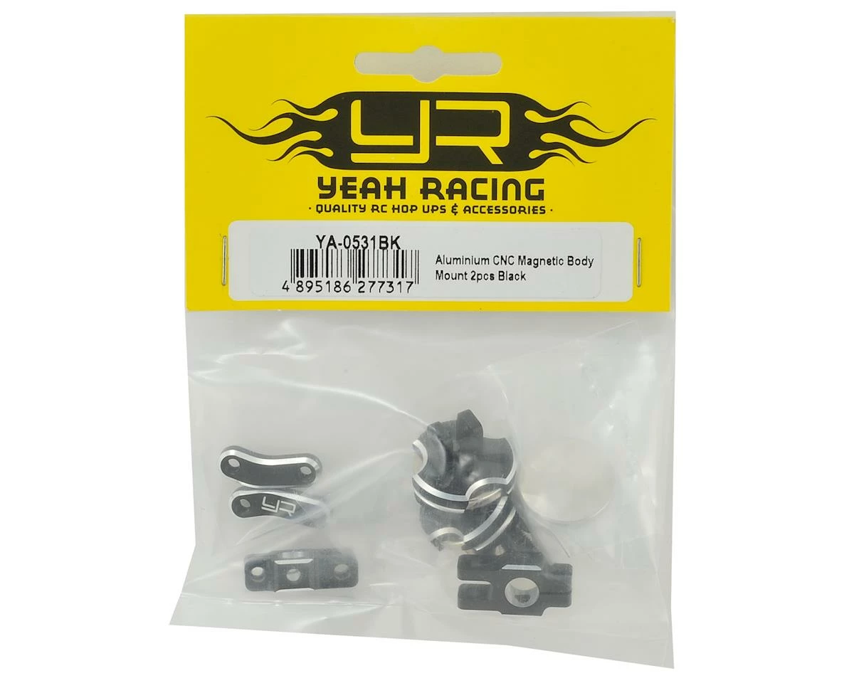 The Yeah Racing Aluminum CNC Magnetic Invisible Body Mount lets you securely mount your body without poking holes that will ruin the scale look of your body. Secure one magnet on the body with either hot glue or double sided tape. The mount has an adjustable angle so that you can mount it perfectly even on curved surfaces! The lower half of the mount is secured to your body mount post with a set screw for secure placement.