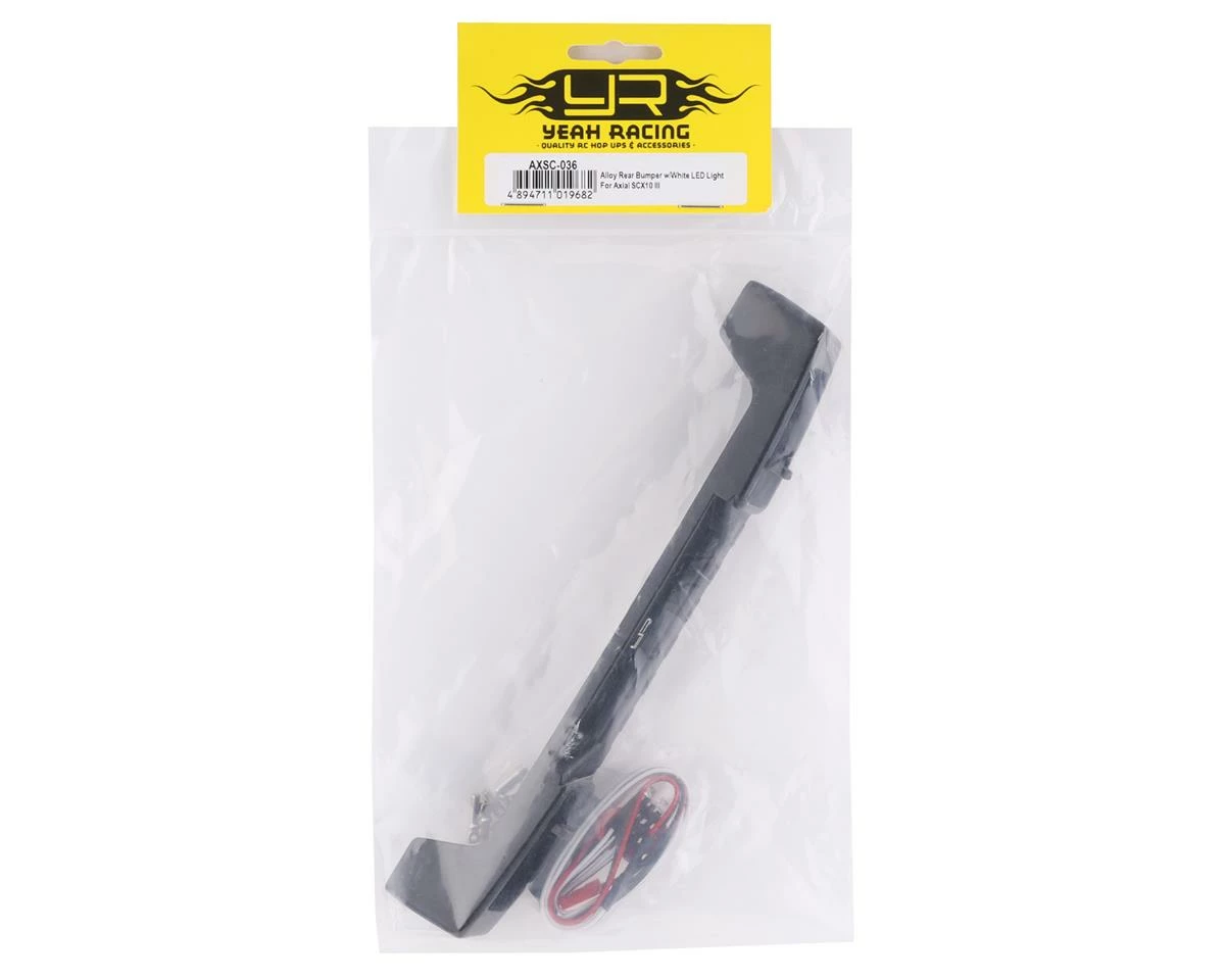 The Yeah Racing Axial SCX10 III Aluminum Rear Bumper w/LEDs is a great option to add scale realism and durability to your crawler. Made from aluminum and anodized black for a clean finish. The included LED lights feature a JST connector for ease of installation. Package includes one rear bumper, two D-rings, two mounts, one LED harness and hardware intended for the Axial SCX10 III.