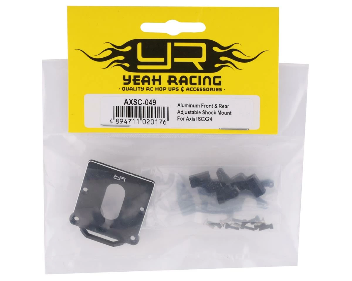 Yeah Racing Axial SCX24 Front and Rear Adjustable Shock Mounts with ESC Plate. These optional shock mounts, paired with the ESC mount, will allow for a stiffer chassis to increase suspension efficiency. Package includes four shock mounts, one ESC mount with brace and hardware intended for the Axial SCX24