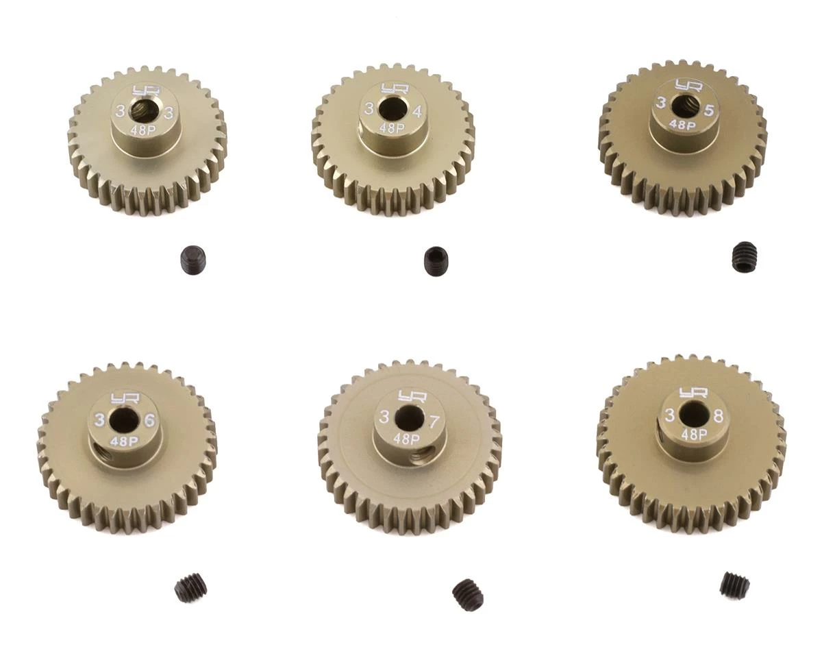 The Yeah Racing Hard Coated 48P Aluminum Pinion Gear Set is a great option for fine tuning your 1/10 chassis. These pinions are titanium coated 7075 aluminum. This allows for a super smooth pinion for better drivetrain efficiency.