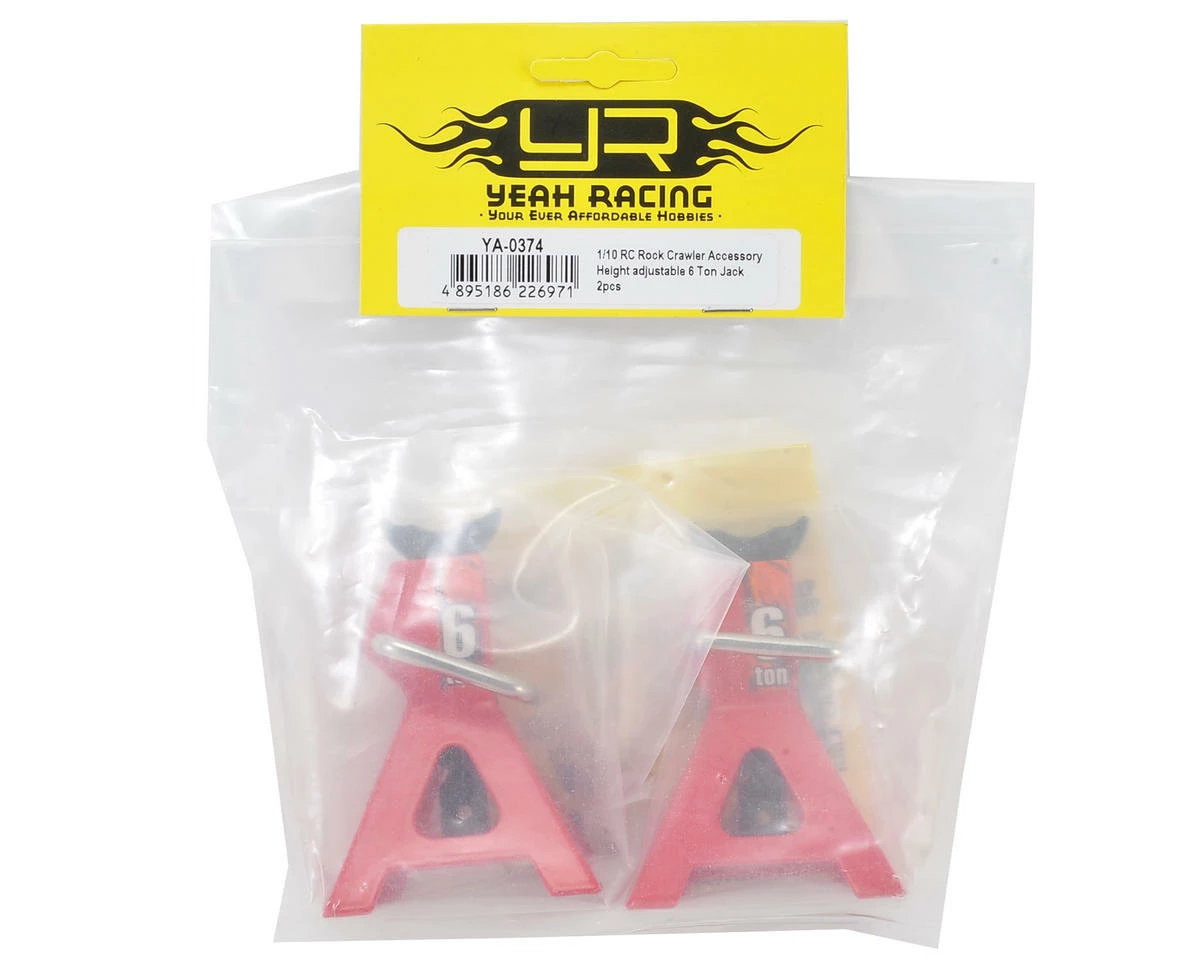 This two pack of Yeah Racing 1/10 Height Adjustable 6 Ton Jacks feature realistic looks and functions similar to the real thing. The jacks can support and hold most cars and trucks safely off the ground, prefect for RC repair work or storage. The metal construction and scale size of the jacks make them easily portable and super tough, making them the perfect addition to your RC garage or auto shop.